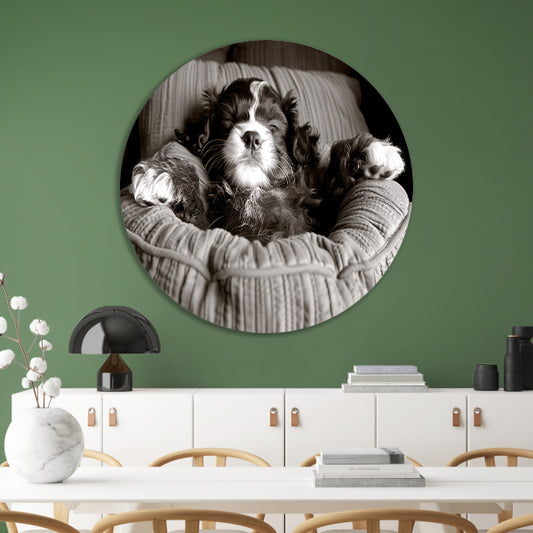 Zwart-wit foto van slapende puppy op deken aluminium muurcirkel
