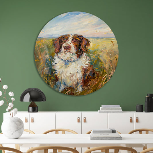 Hondenschilderij in een kleurrijk landschap aluminium muurcirkel