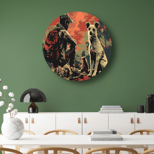 Zonsondergang met Hond en Bewaker aluminium muurcirkel