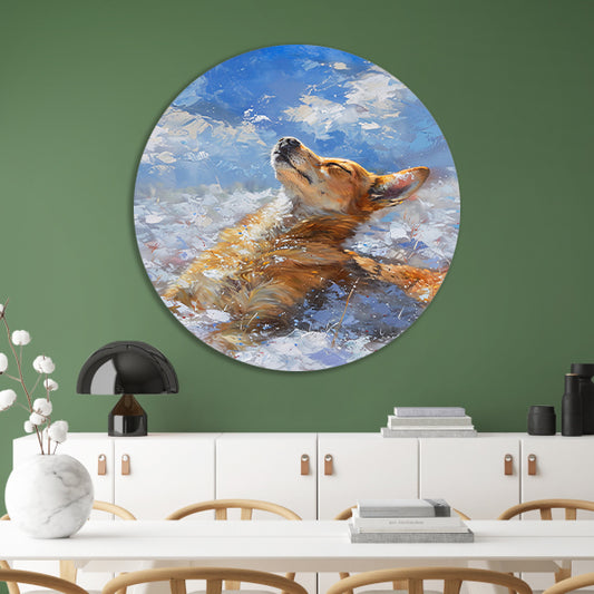 Hond genietend van de sneeuw en zon aluminium muurcirkel