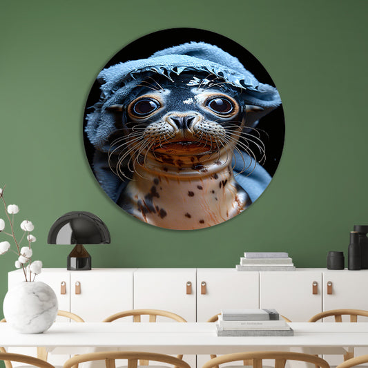 Zeehondje in een blauwe handdoek aluminium muurcirkel