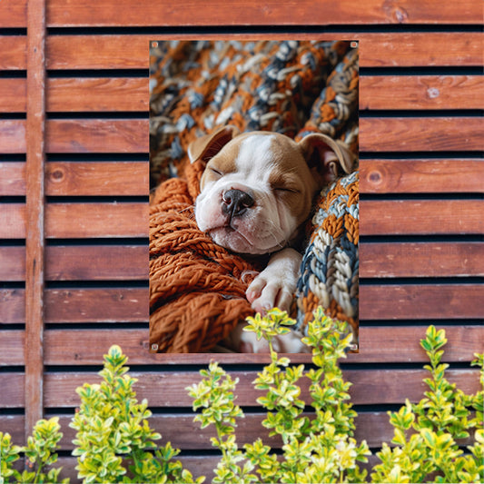 Bulldog Puppy Slaapt in Warme Deken tuinposter
