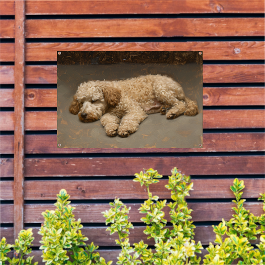 Schilderij van slapende hond in impressionistische stijl tuinposter