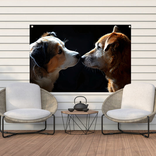 Twee honden in donkere omgeving kijken elkaar aan tuinposter