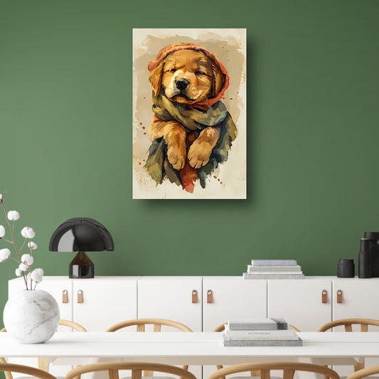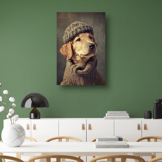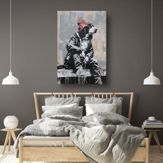 Zwart-witte hond met rode muts op betonnen richel canvas