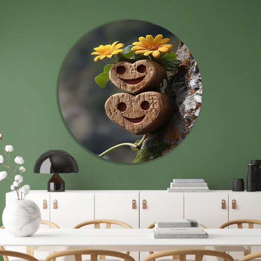 Twee houten harten met gele bloemen aluminium muurcirkel