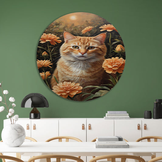 Oranje Kat tussen Bloeiende Goudsbloemen aluminium muurcirkel