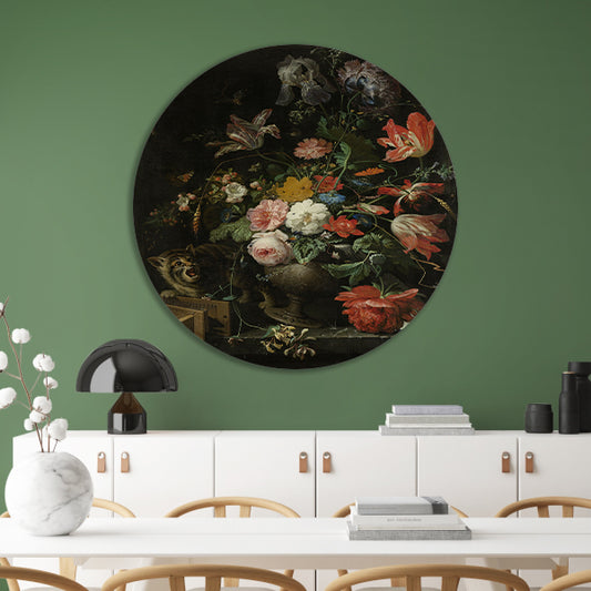 Bloemstilleven met kat en muizenval - Abraham Mignon aluminium muurcirkel