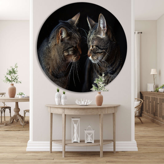 Twee katten in donkere omgeving kijken elkaar aan aluminium muurcirkel