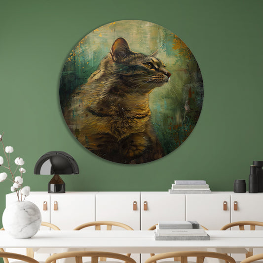 Elegante kat in kleurrijke olieverf aluminium muurcirkel