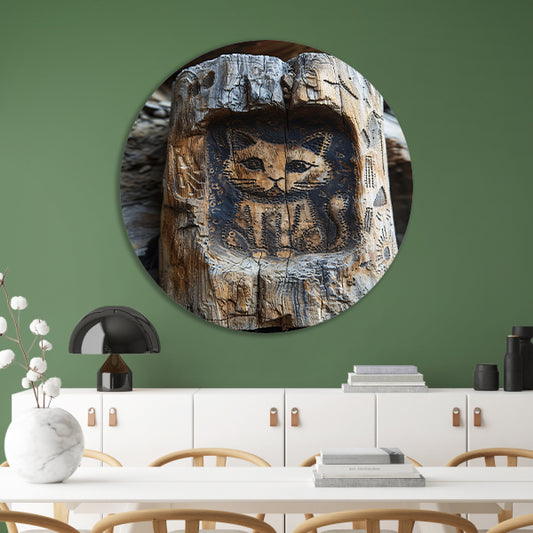 Houtsnijwerk van een Kat in een Boomstam aluminium muurcirkel