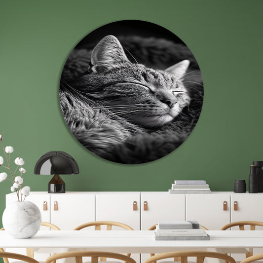Zwart-witfoto van een slapende kat aluminium muurcirkel