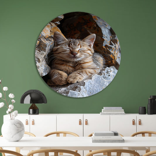 Jonge kat slaapt vredig tussen rotsen aluminium muurcirkel