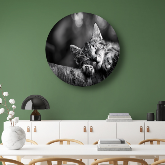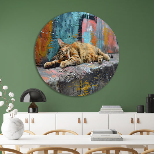 Slapende kat bij gekleurde muur aluminium muurcirkel