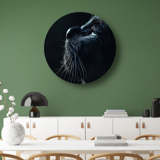 Zwarte kat in het schaduwspel aluminium muurcirkel