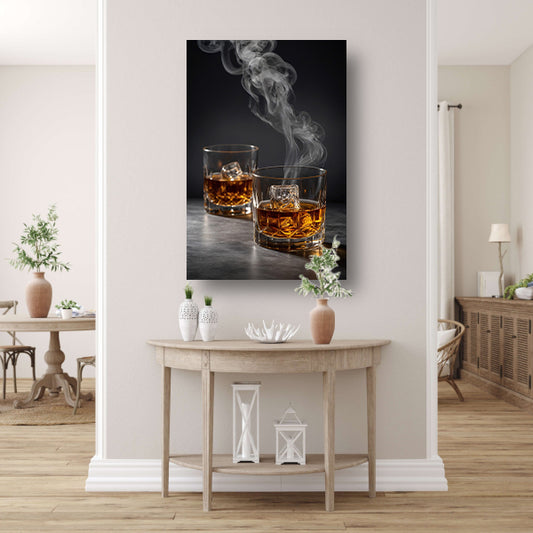 Elegante whiskeyglazen met rook op zwarte achtergrond canvas met baklijst