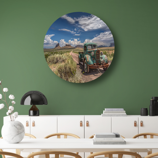 Eenzame vrachtwagen op verlaten weg aluminium muurcirkel