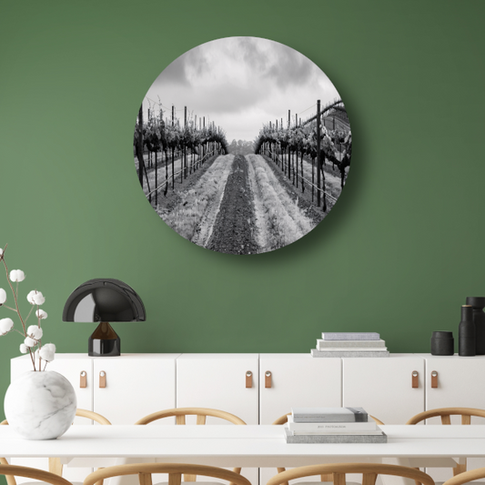 Wijngaard onder grijze hemel aluminium muurcirkel