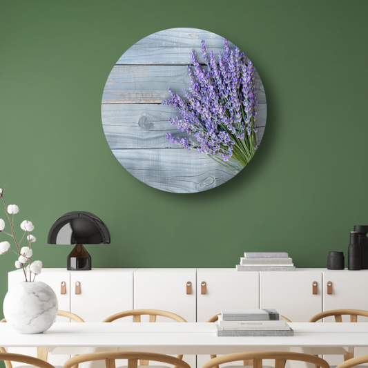 Lavendel stilleven op houten tafel aluminium muurcirkel