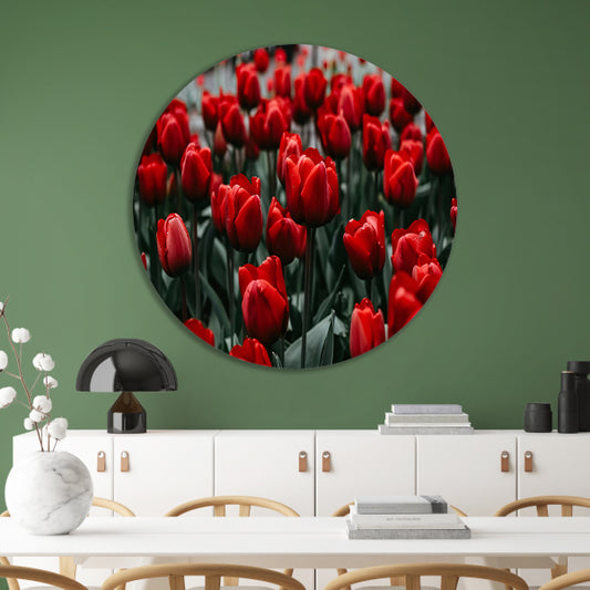 Heldere rode tulpen met groene bladeren aluminium muurcirkel
