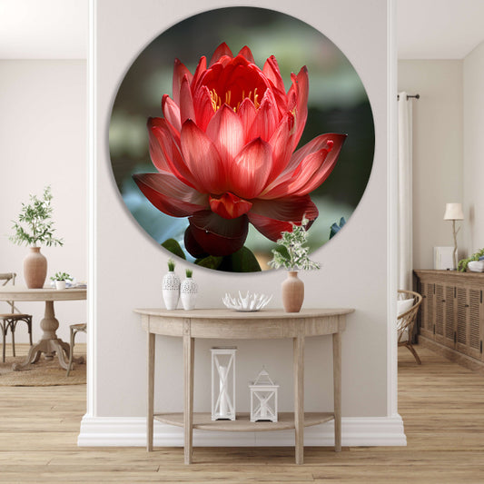 Rode lotus met groene bladeren in detail aluminium muurcirkel