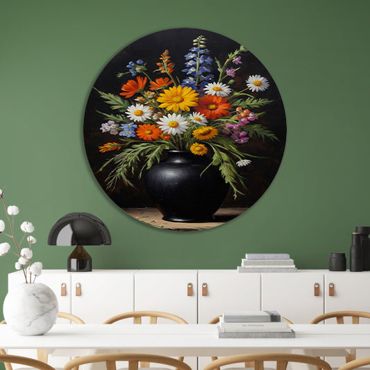Kleurrijke Wildbloemen in Zwarte Antieke Vaas aluminium muurcirkel
