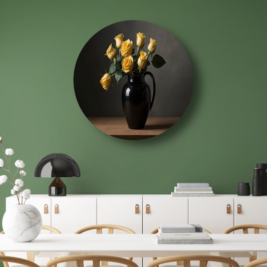 Zwart vaas met gele rozen stilleven aluminium muurcirkel