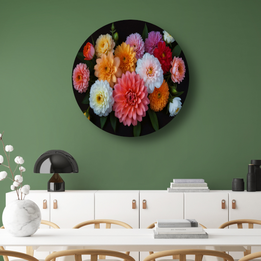 Levendige Bloemensamenstelling op Diepzwarte Achtergrond aluminium muurcirkel