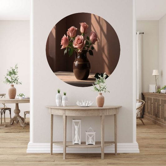 Roze Rozen in Bruine Vaas met Schaduwspel aluminium muurcirkel