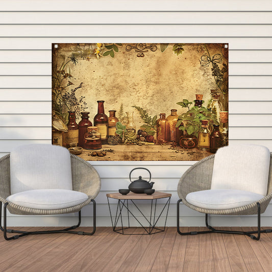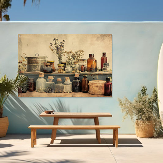 Antieke apotheek met glazen flessen en kruiden tuinposter