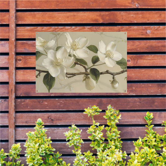 Witte bloemen op tak tegen beige achtergrond tuinposter
