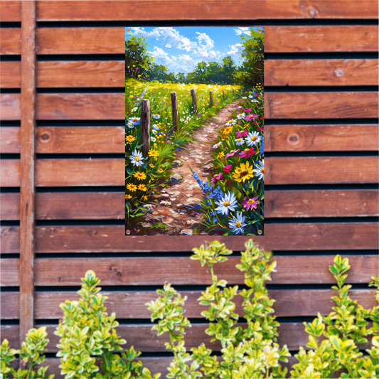 Schilderachtig bloemenpad in kleurrijk landschap tuinposter