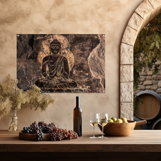 Meditatief Boeddha Sculptuur in Rotswand tuinposter