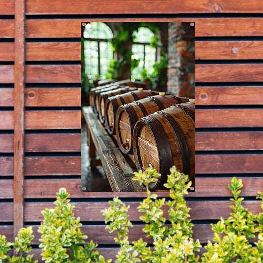Rij oude eikenhouten vaten in een kelder tuinposter