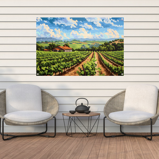 Rustige wijngaard met landhuis onder blauwe lucht tuinposter
