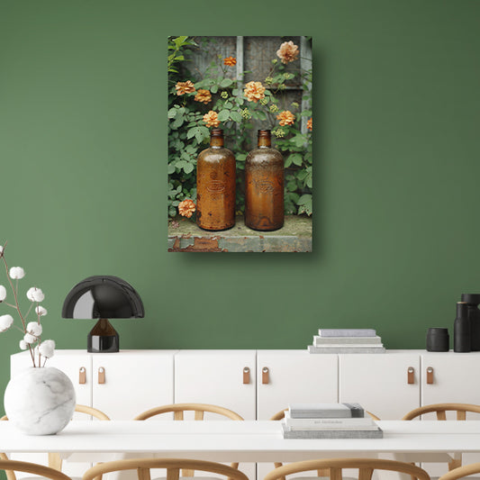 Twee oude flessen met bloemen poster