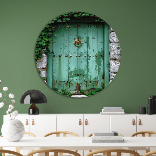 Verweerde groene deur met gouden accenten aluminium muurcirkel