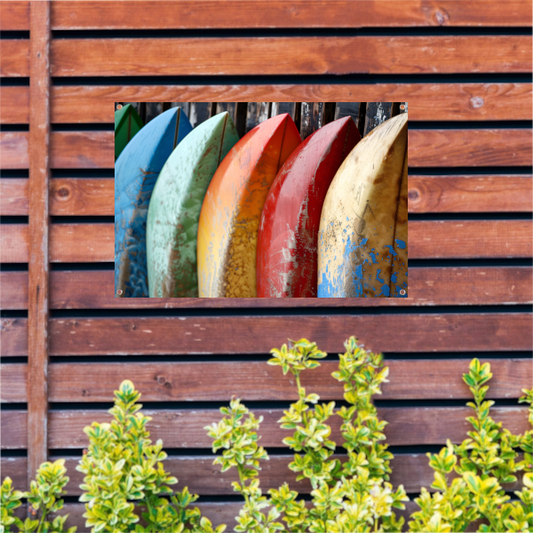 Kleurrijke Surfplank in Glinsterende Zee bij Zonsondergang tuinposter