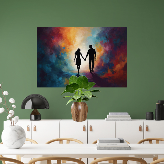 Hand in Hand: Silhouet tegen Kleurenpracht canvas met baklijst