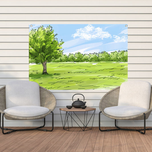 Serene Boom en Grasveld Onder Blauwe Lucht tuinposter