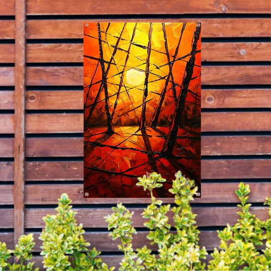 Kleurrijke abstracte zonsondergang met bomen tuinposter