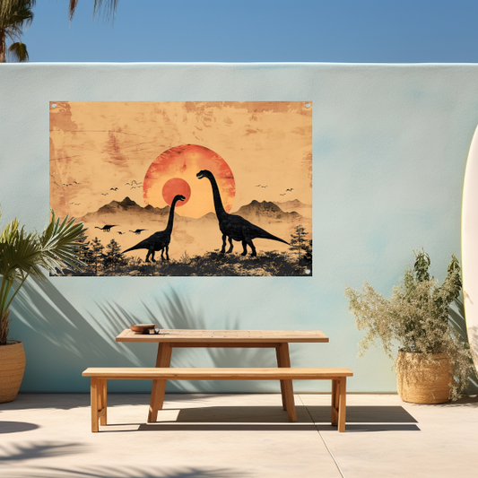 Silhouetten van dinosaurussen tijdens zonsondergang tuinposter