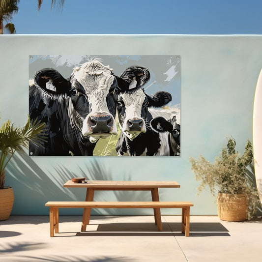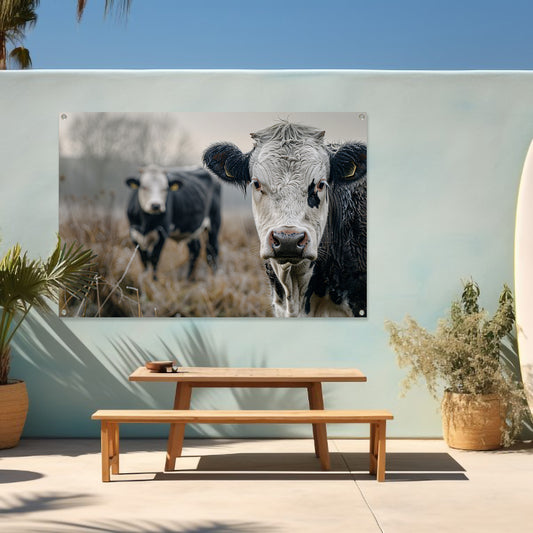 Realistische close-up van nieuwsgierige koeien tuinposter
