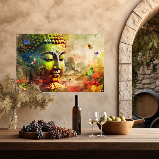 Eclectische Boeddha met Kleurrijke Achtergrond tuinposter