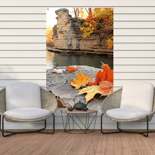 Herfstbladeren langs de rivier bij rotsen tuinposter