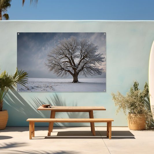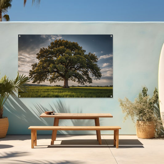 Majestueuze boom in uitgestrekt landschap tuinposter