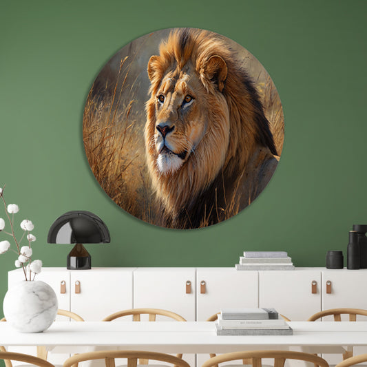 Realistische leeuw in savanne landschap aluminium muurcirkel