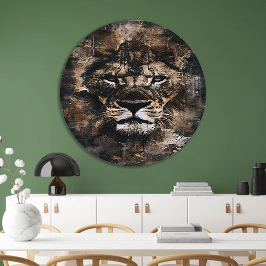 Mysterieus leeuwenportret in rustieke stijl aluminium muurcirkel