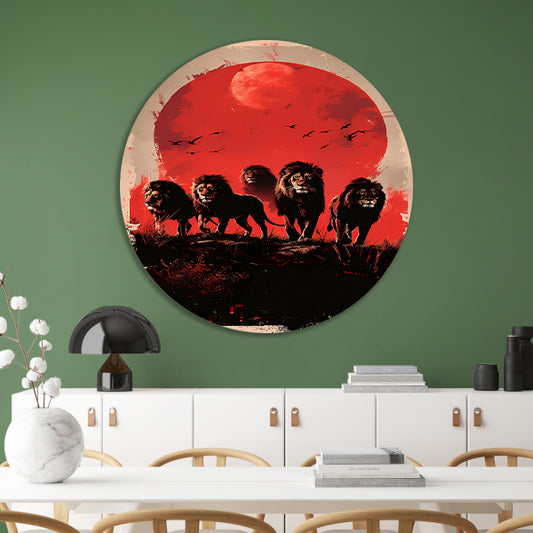 Leeuwen bij zonsondergang aluminium muurcirkel