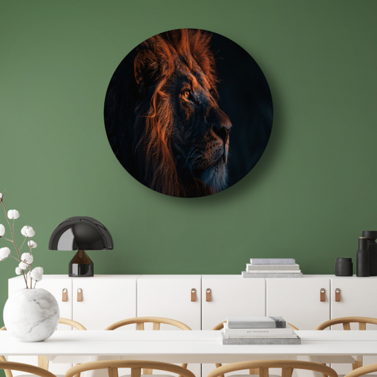 Leeuw in Schemerlicht met Gouden Manen aluminium muurcirkel
